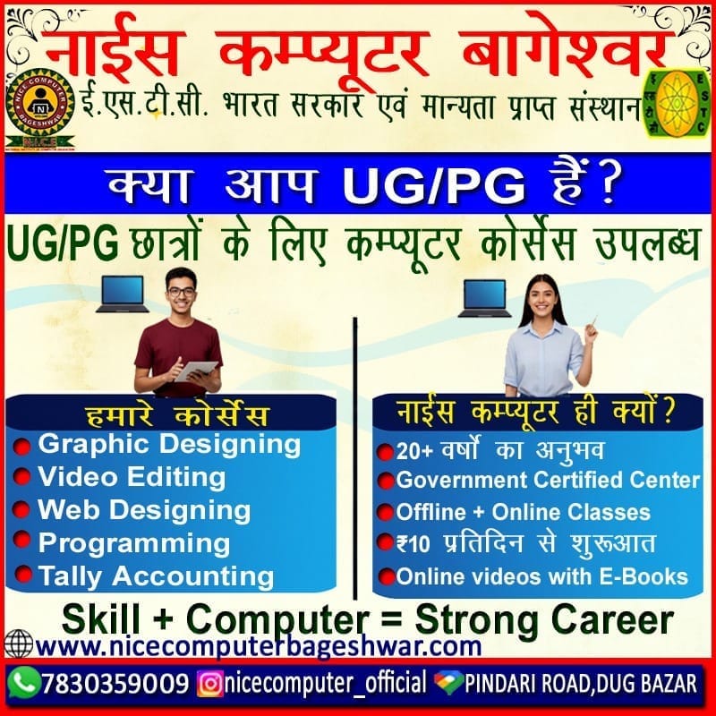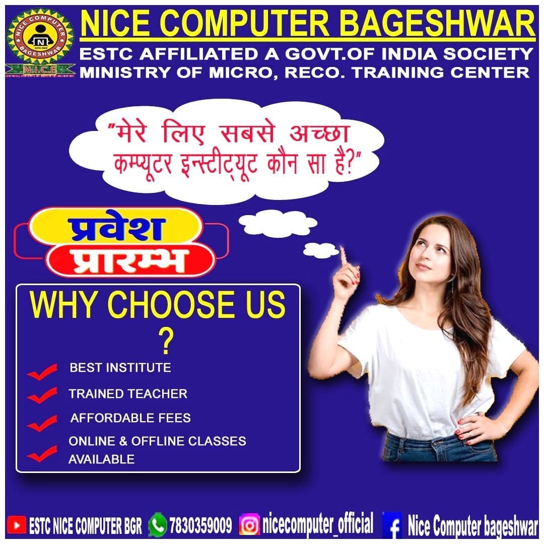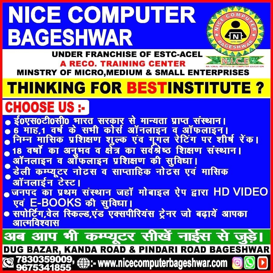 नाइस कंप्यूटर बागेश्वर ESTC- (Electronics Service & Training Centre) द्वारा मान्यता प्राप्त संस्था है, जो की भारत सरकार की संस्था है.